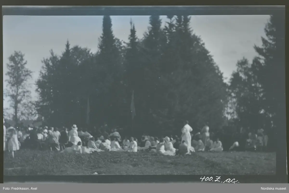 Folksamling på en äng. Många sitter ner i gräset och umgås.