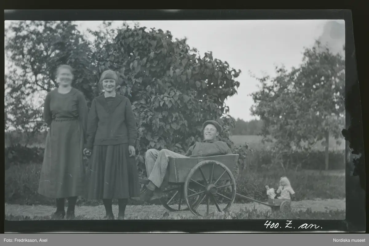 Två unga kvinnor drar en skrinda/ kärra som en ung man sitter i. Han drar i sin tur en liten leksakskärra med ett par dockor i.