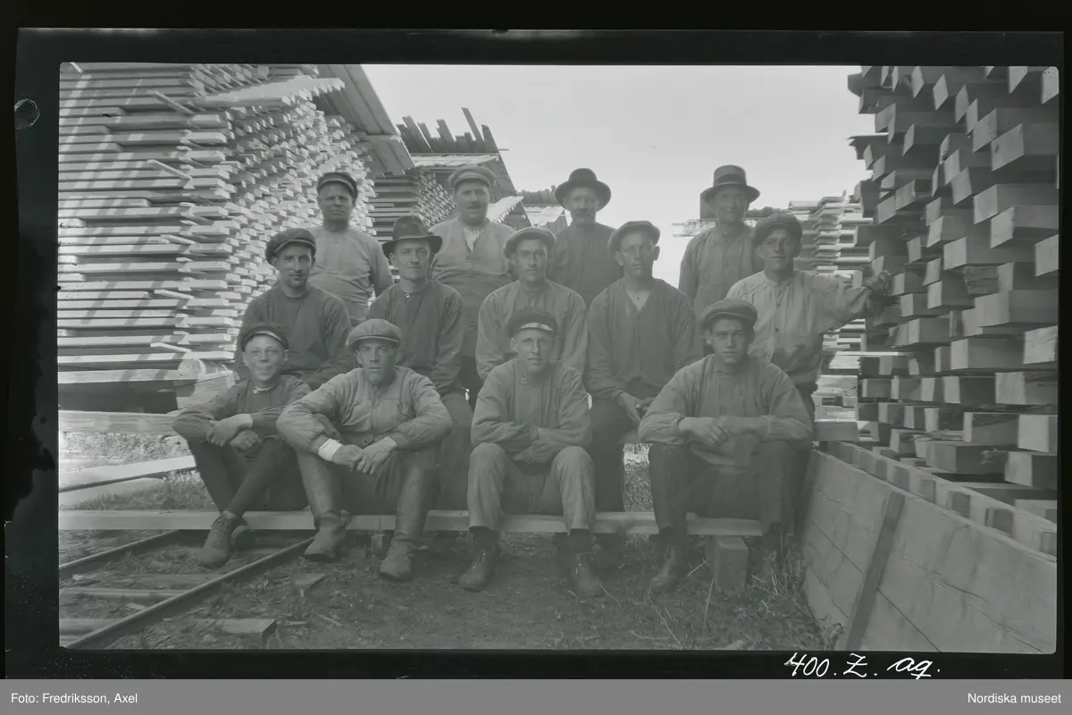 Ett arbetslag porträtterade mellan staplat uppsågat virke/ brädor.