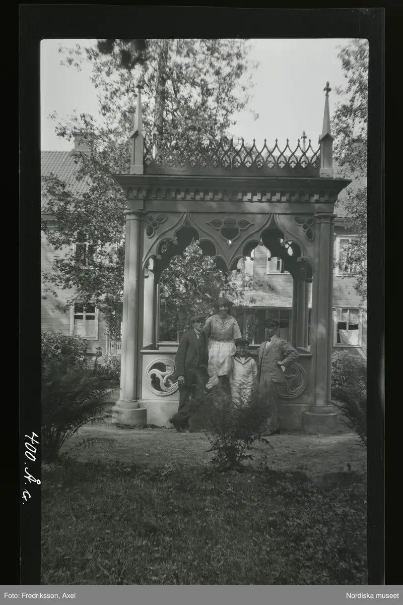 Ett sällskap vid en paviljong i en trädgård. En kvinna som sitter på räcket, två män och en liten pojke.