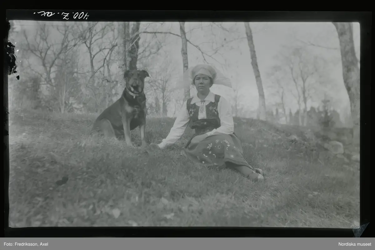 Porträtt av en kvinna i dräkt och en hund, som sitter på gräset utomhus.