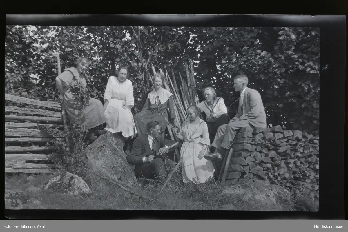 Ett sällskap sitter ute på en gärdsgård och en vedstapel.