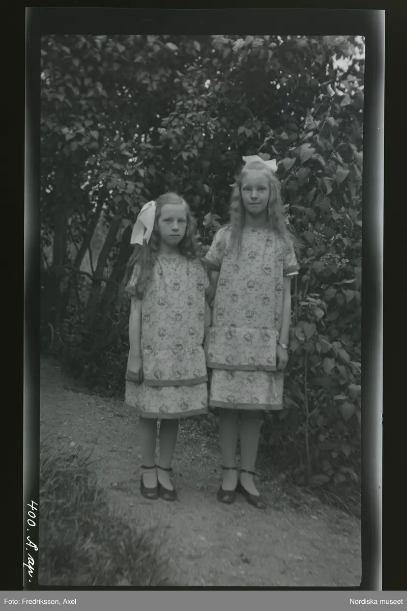 Två flickor i likadana klänningar och skor och rosett i håret.