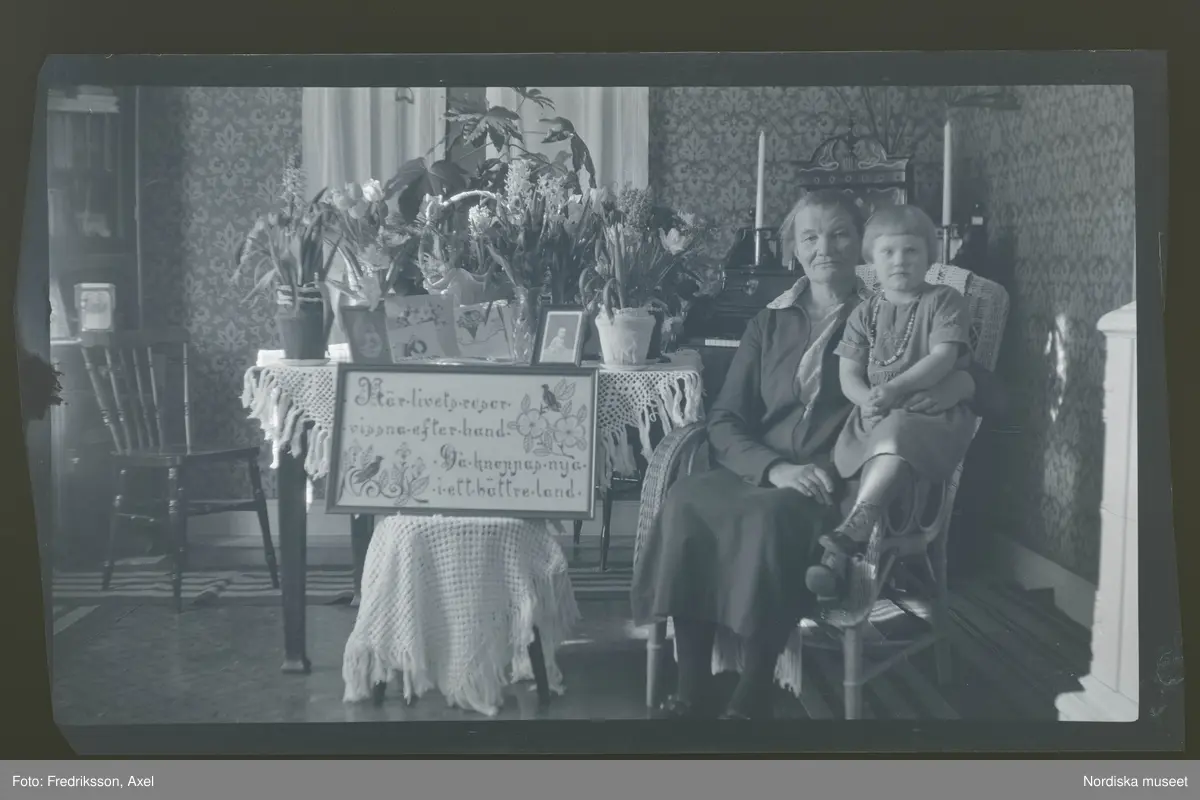 Porträtt av en äldre kvinna med en flicka i knät, som sitter vid ett bord med gratulations-blommor.