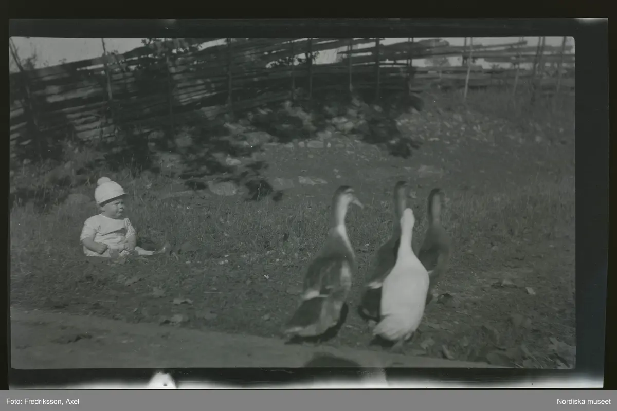 Ett litet barn sitter i gräset och tittar på några gäss som går förbi.