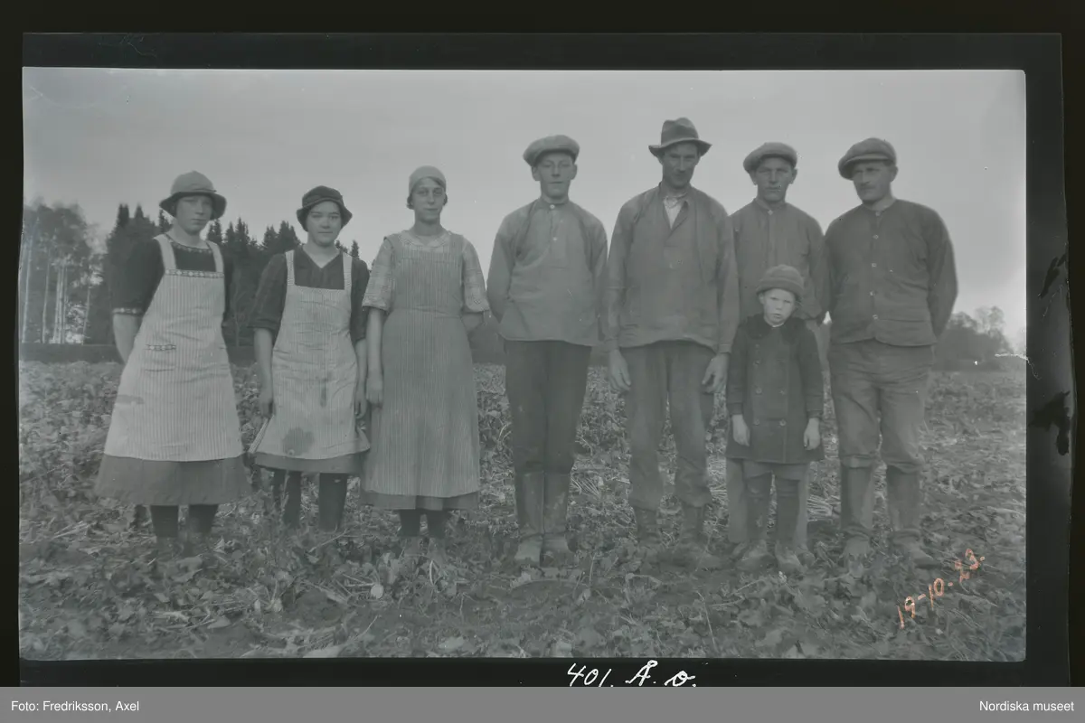 Ett arbetslag poserar på en åker. Längst till höger Axel Fredriksson.