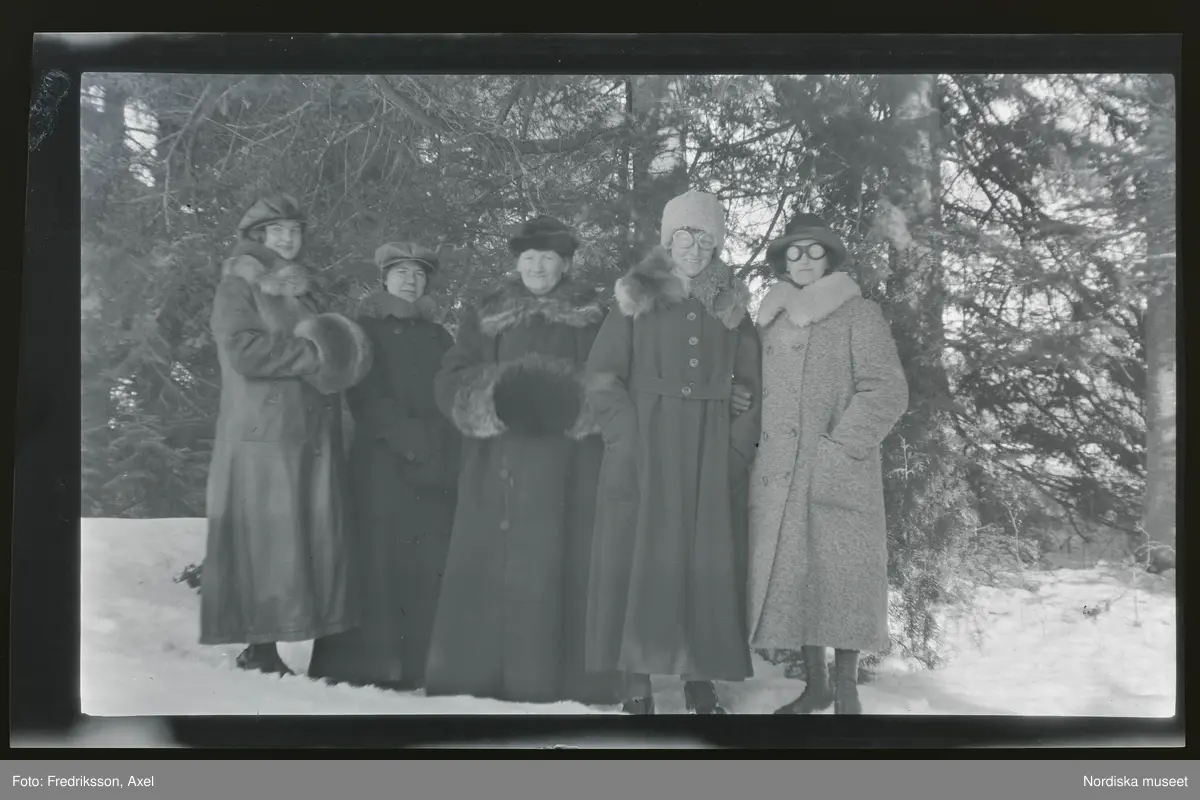 Fem kvinnor klädda i kappor med pälskrage.