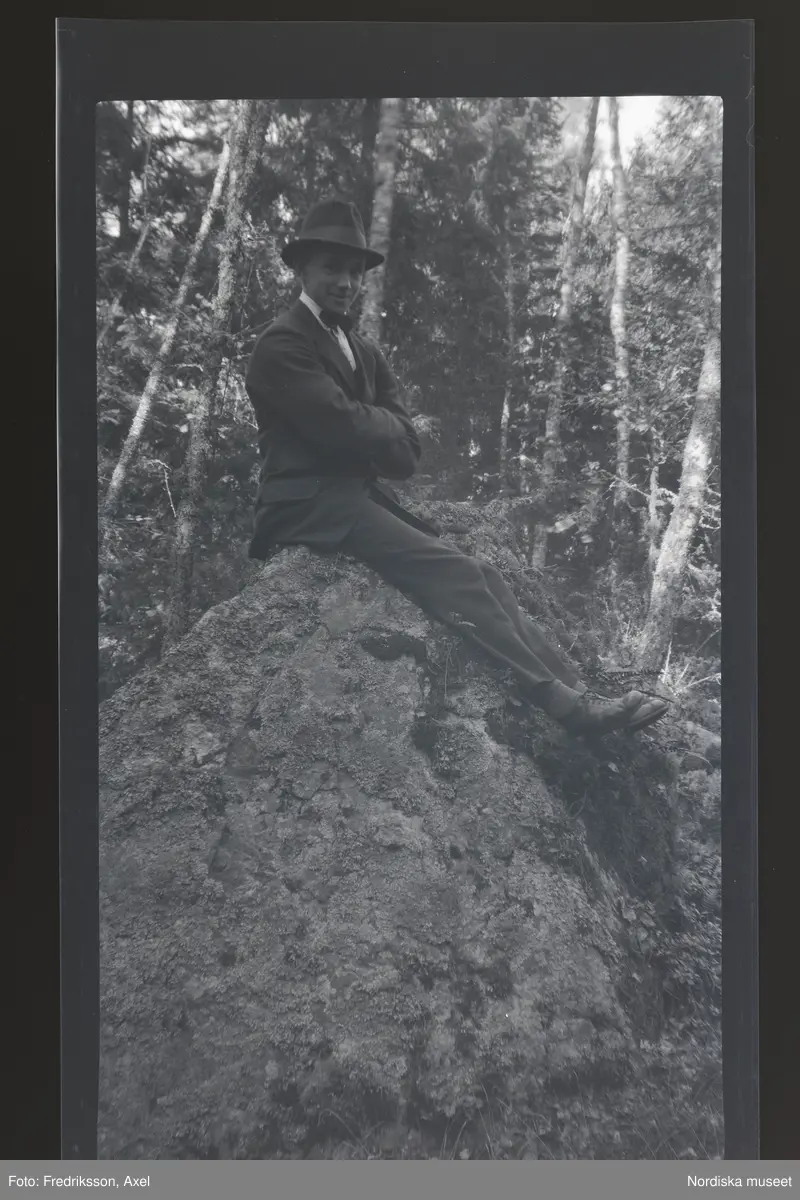 Porträtt av en ung man sittandes på en stor sten i skogen.