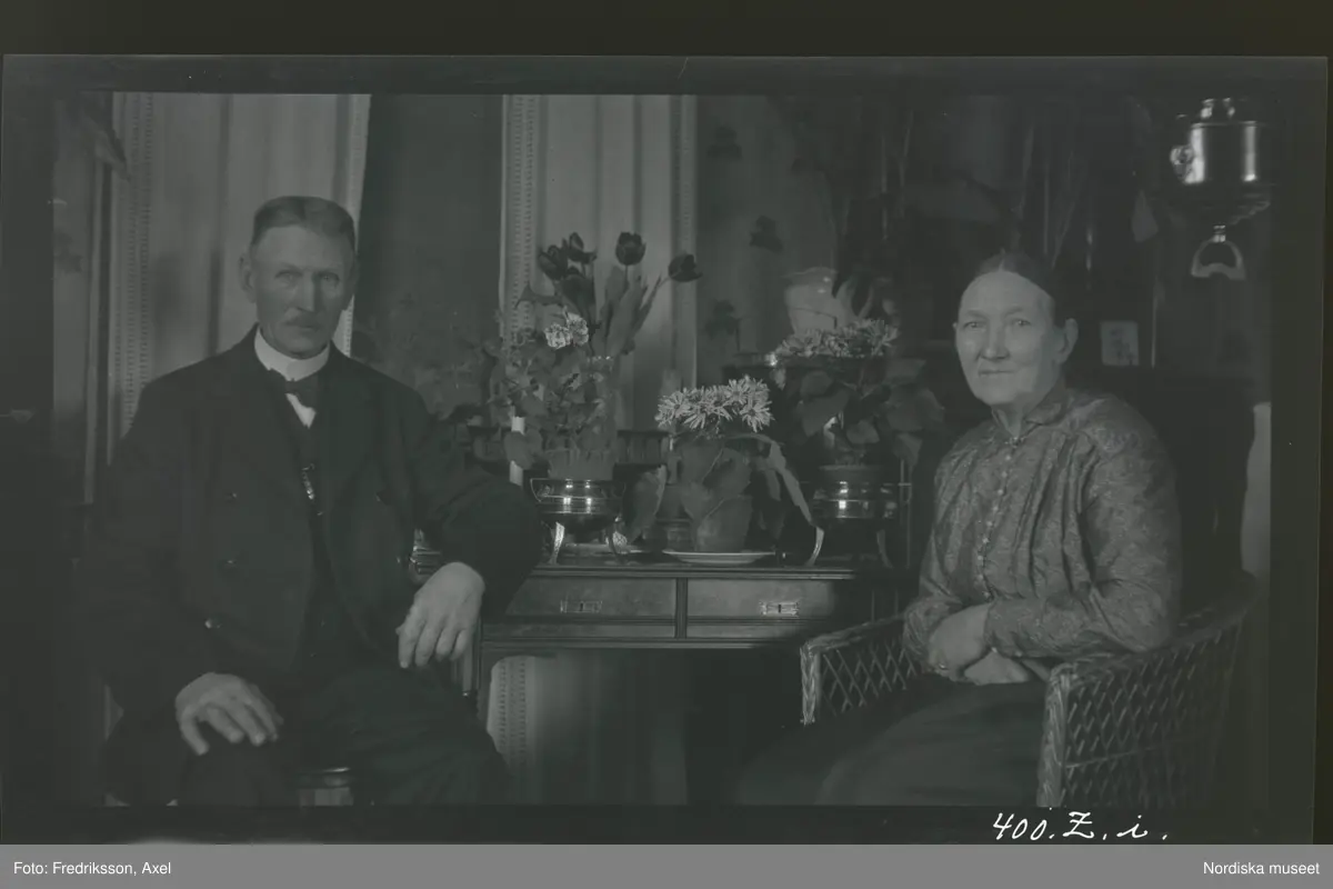 En man och en kvinna sittandes vid ett skrivbord i sitt hem. På bordet står krukväxter och blommor.