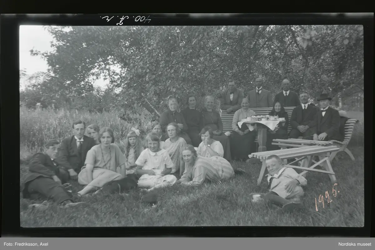 Ett sällskap i alla åldrar i en trädgård. På trädgårdsmöblernas bord står kaffe och kakor uppdukade.