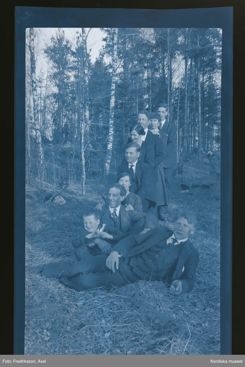 "Gårdshushållet, Fogelstad; uppifrån: ?, Tora Johansson, Mo Gustav Larsson, Formartorp. Elsa Råstedt Rulle Samuelsson (gift med Tora) Ruth Pettersson David Carlsson Nils Råstedt ?"