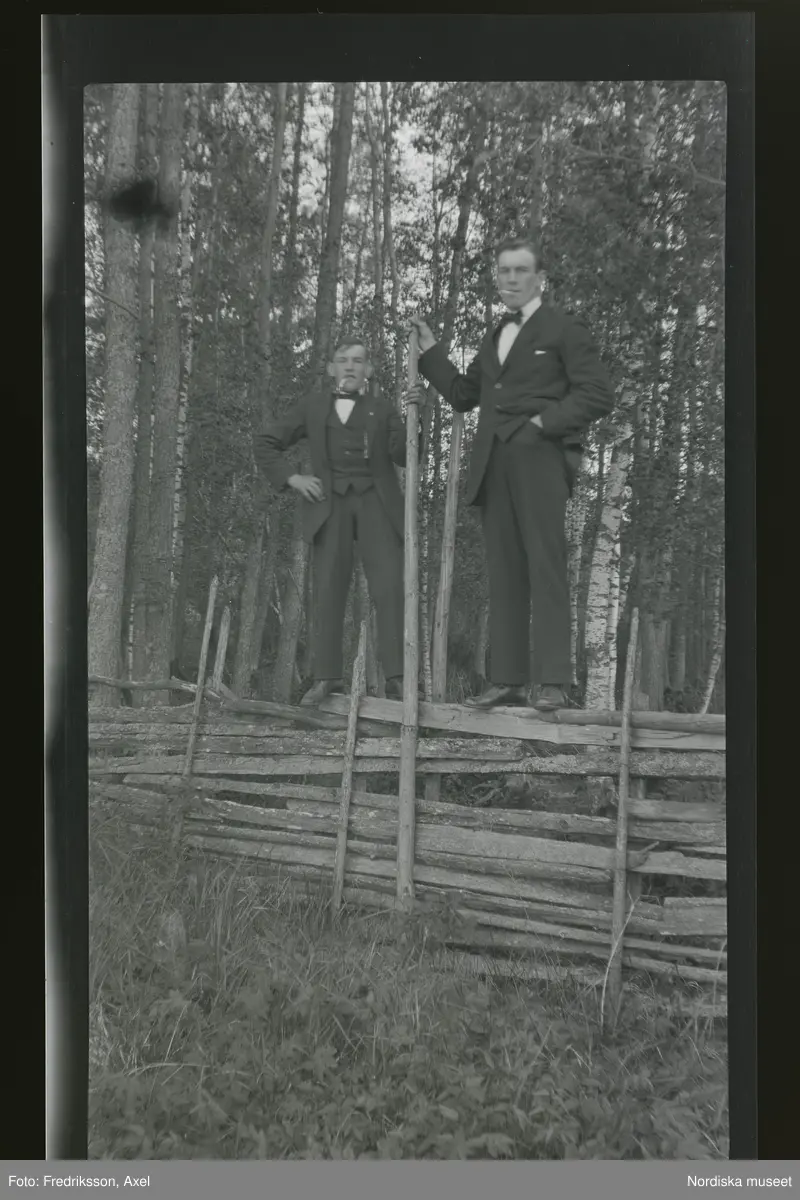 Två unga män poserar ståendes uppe på en gärdsgård.