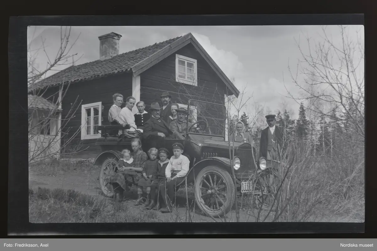 Ett sällskap i och kring en bil, som står utanför ett hus.