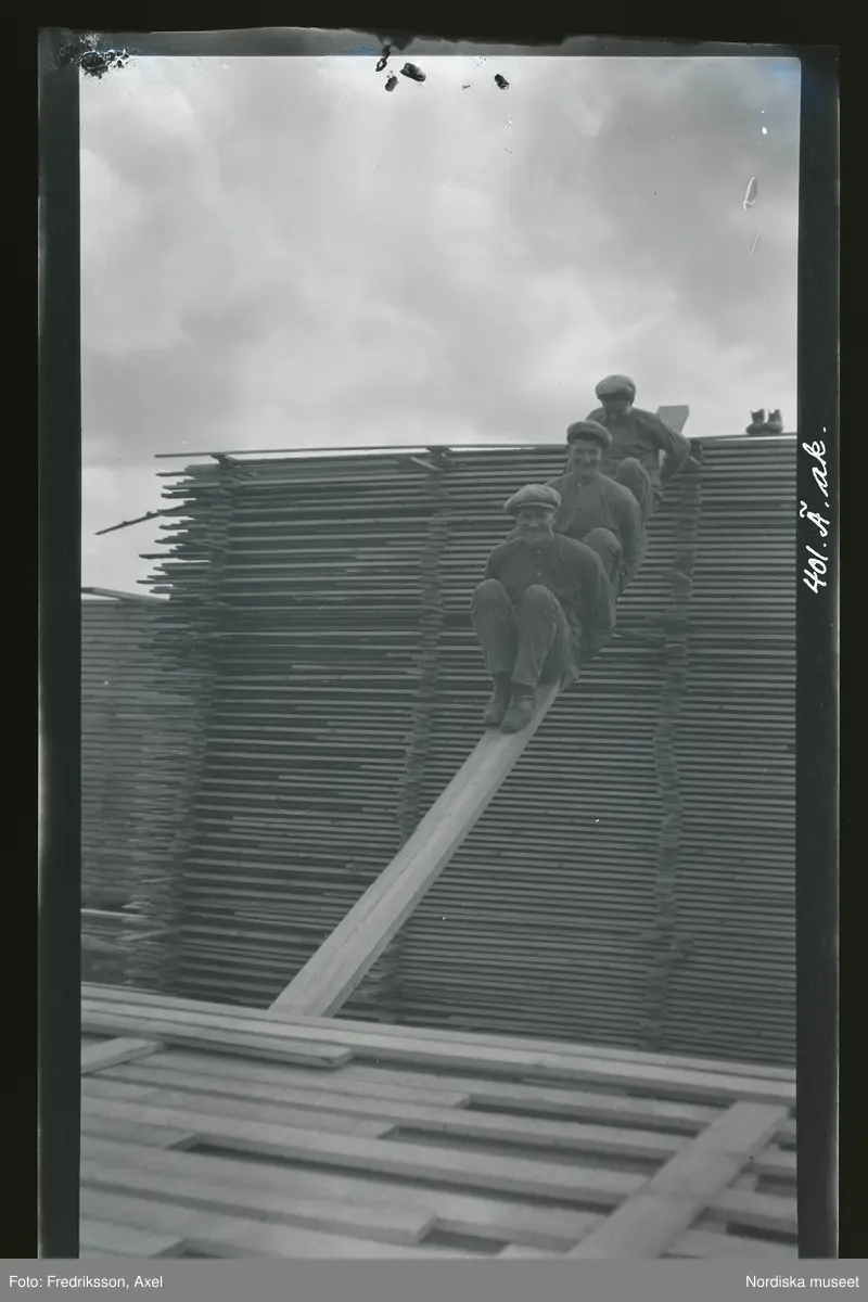 Tre sågarbetare poserar på skoj sittandes på en planka lutad mot en hög staplat virke.