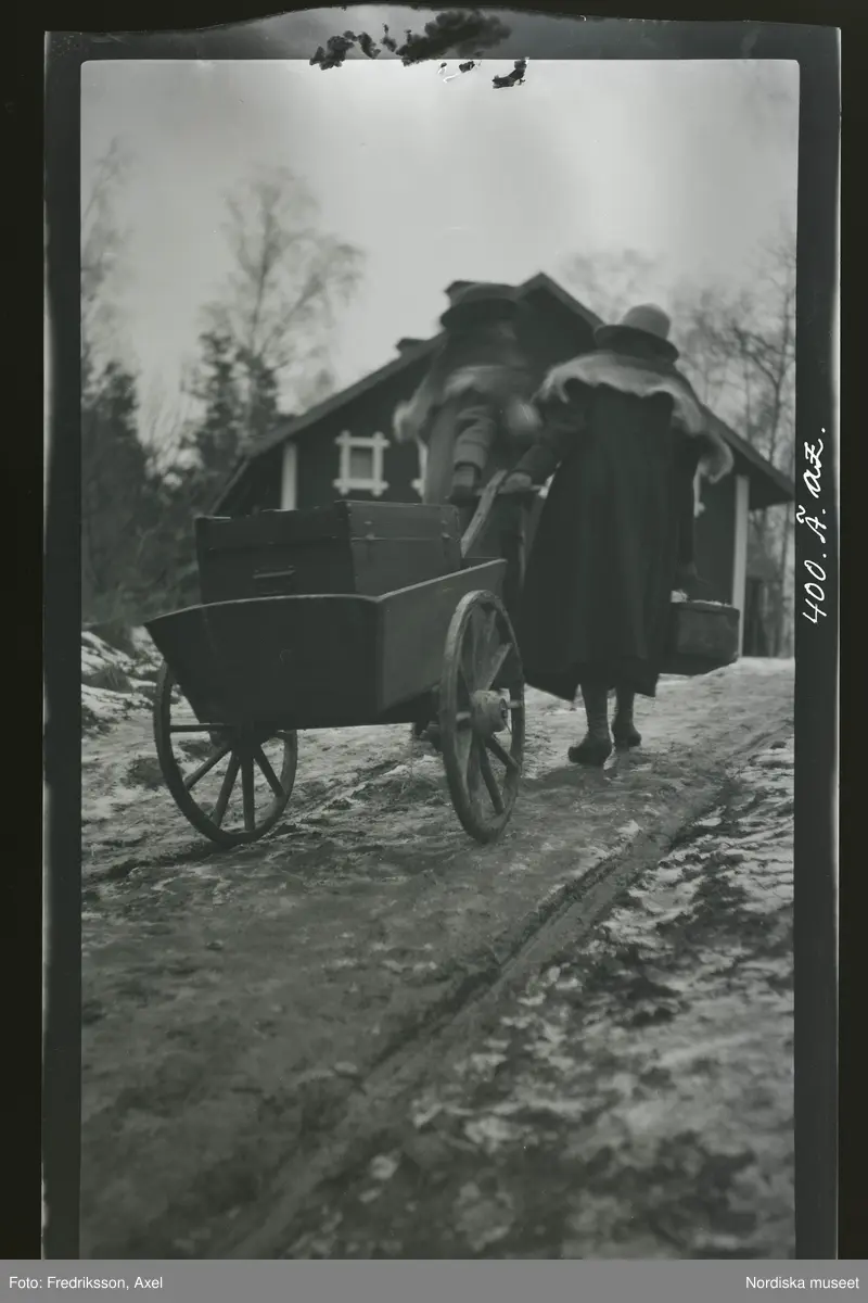 Två kvinnor drar en kärra med en koffert längs en snöig väg.