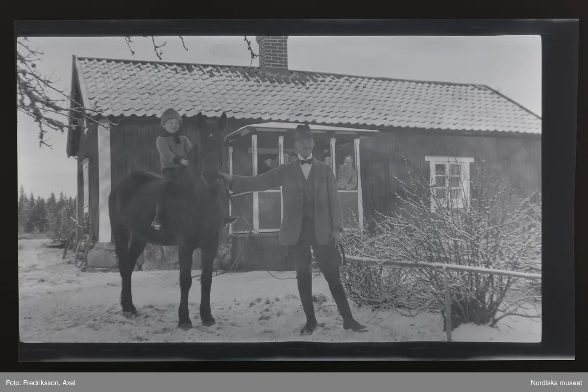 En pojke sitter på en häst, en man står intill och håller i tygeln. Flera personer står och betraktar dem från farstubron bakom dem.
