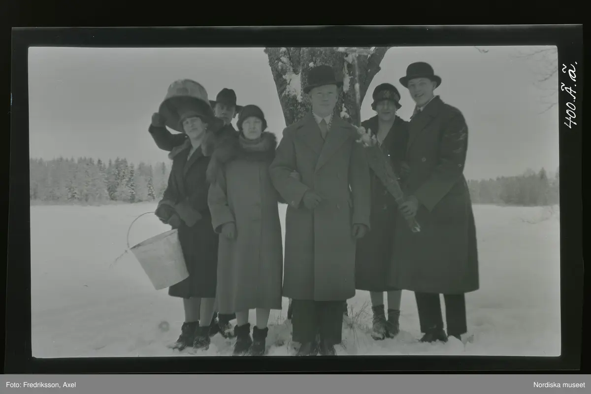 Grupporträtt av några människor fotograferade utomhus i snön. Ett par bär hinkar och en man ett ris som det sitter en liten docka i.