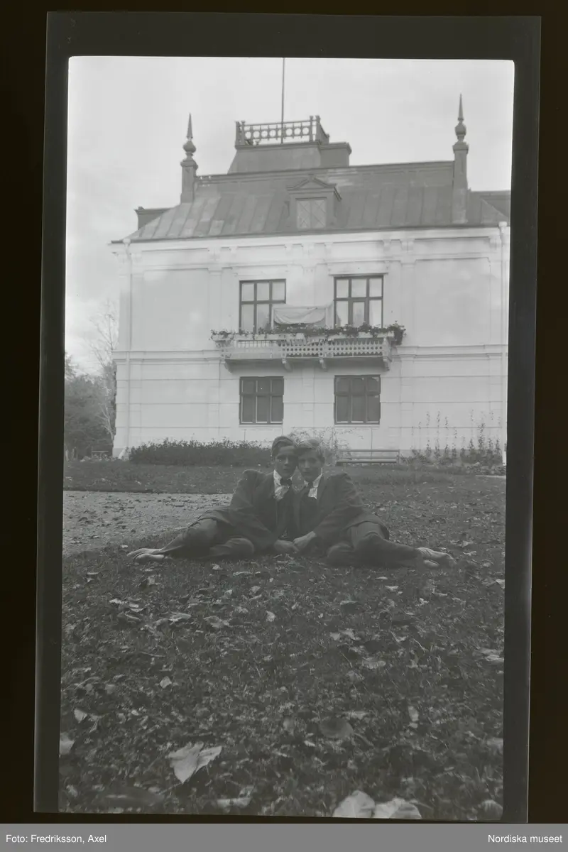 Två unga män ligger på gräset framför en byggnad. De håller varandra i handen och huvudena tätt ihop.