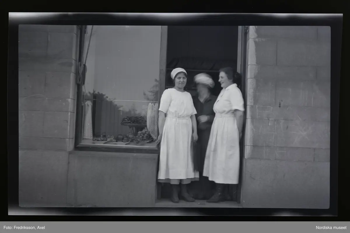 Tre kvinnor står i dörren till ett bageri. I skyltfönstret står fat med kakor.