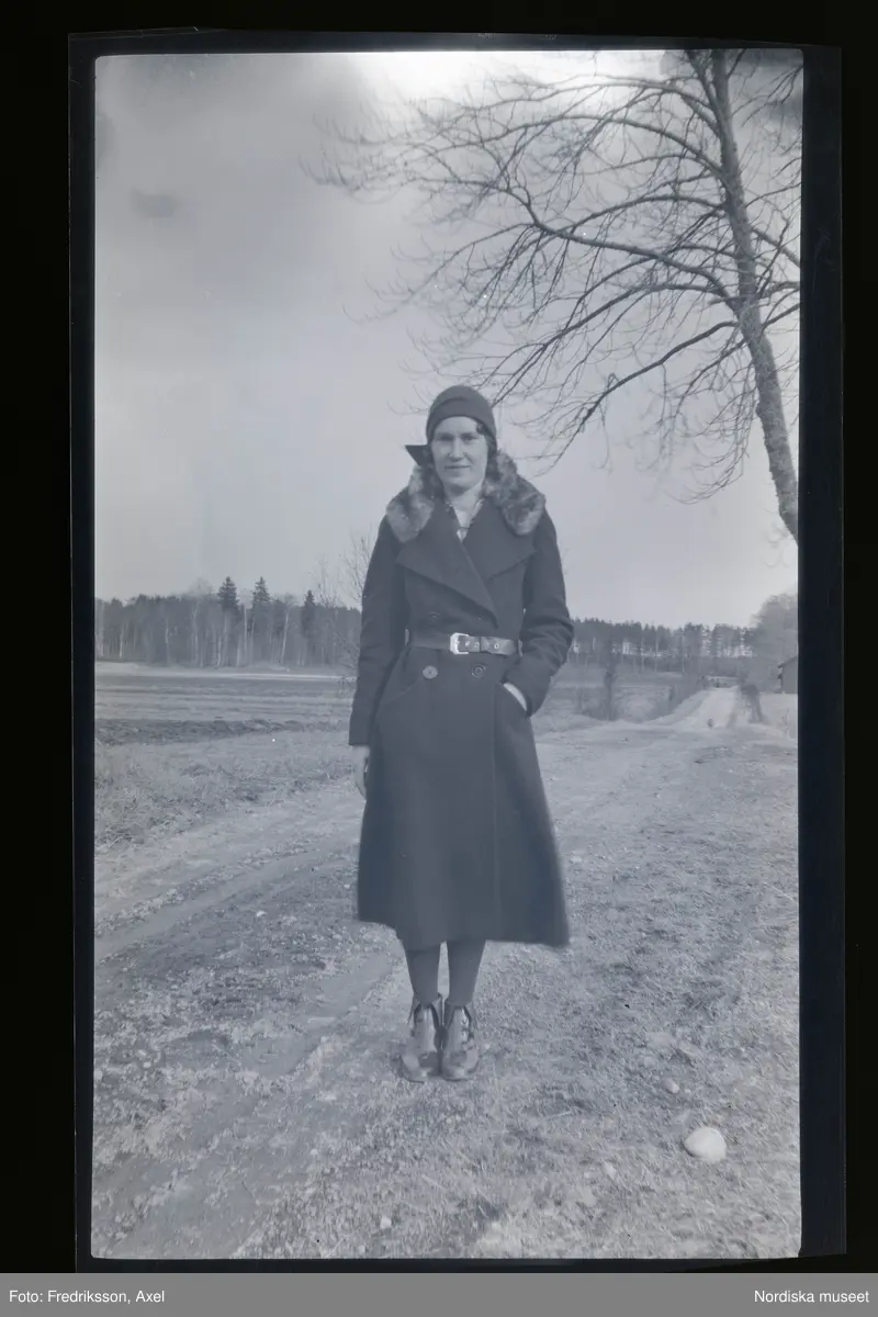 Porträtt av en kvinna, ståendes ute på en landsväg.