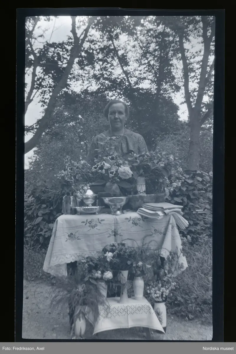 Porträtt av en kvinna som står bakom ett bord med gratulations-blommor.