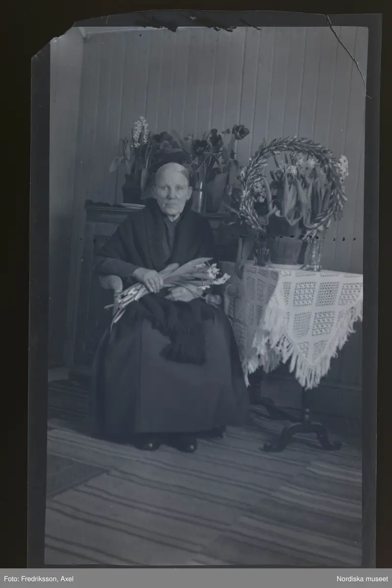 Porträtt av en kvinna som sitter vid ett bord med gratulations-blommor. Hon har en bukett narcisser.