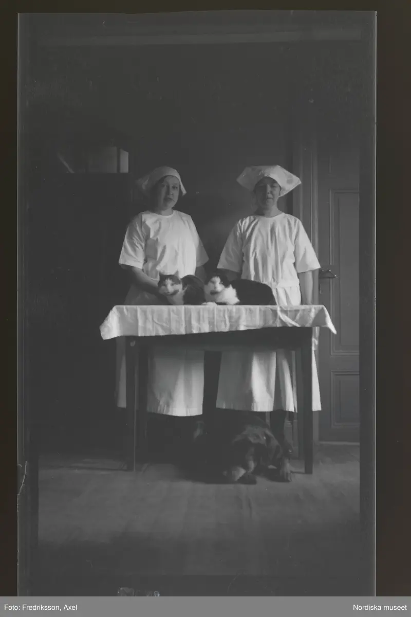 Två kvinnor poserar i ett kök. På ett bord framför dem ligger två katter och under bordet en hund.