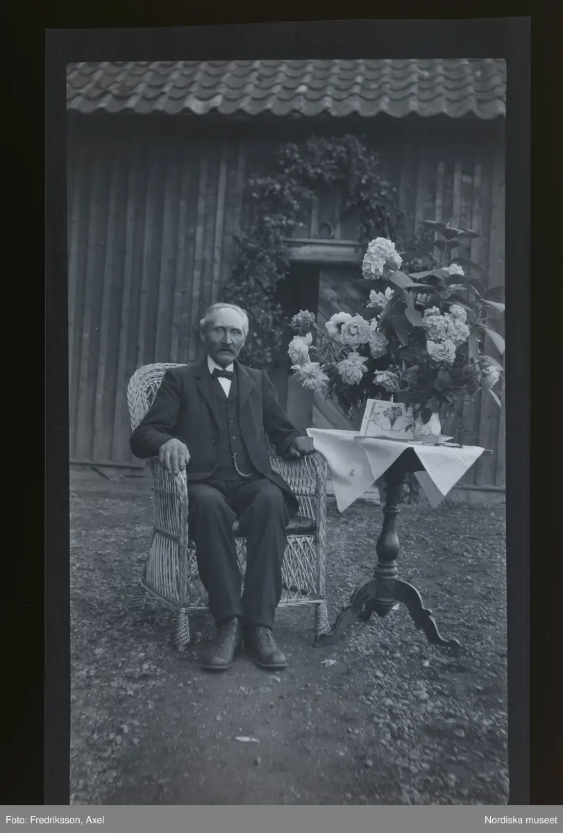 Porträtt av en man som sitter vid ett bord med gratulations-blommor.