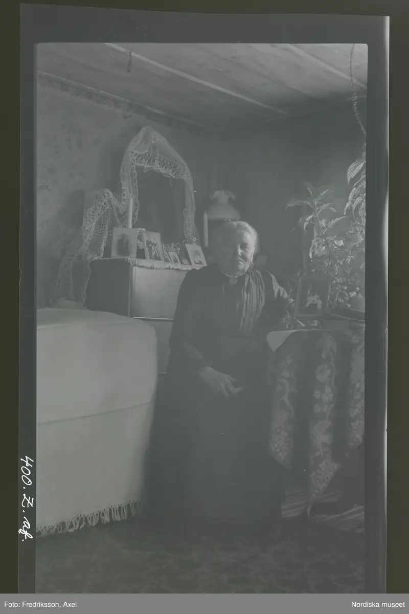 En kvinna sittandes med en bok i handen. På byrån bakom henne och på bordet intill står inramade familjeporträtt.