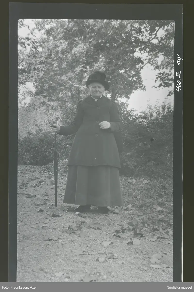 Porträtt av en kvinna ståendes utomhus, klädd i kappa och med ett paraply i ena handen.