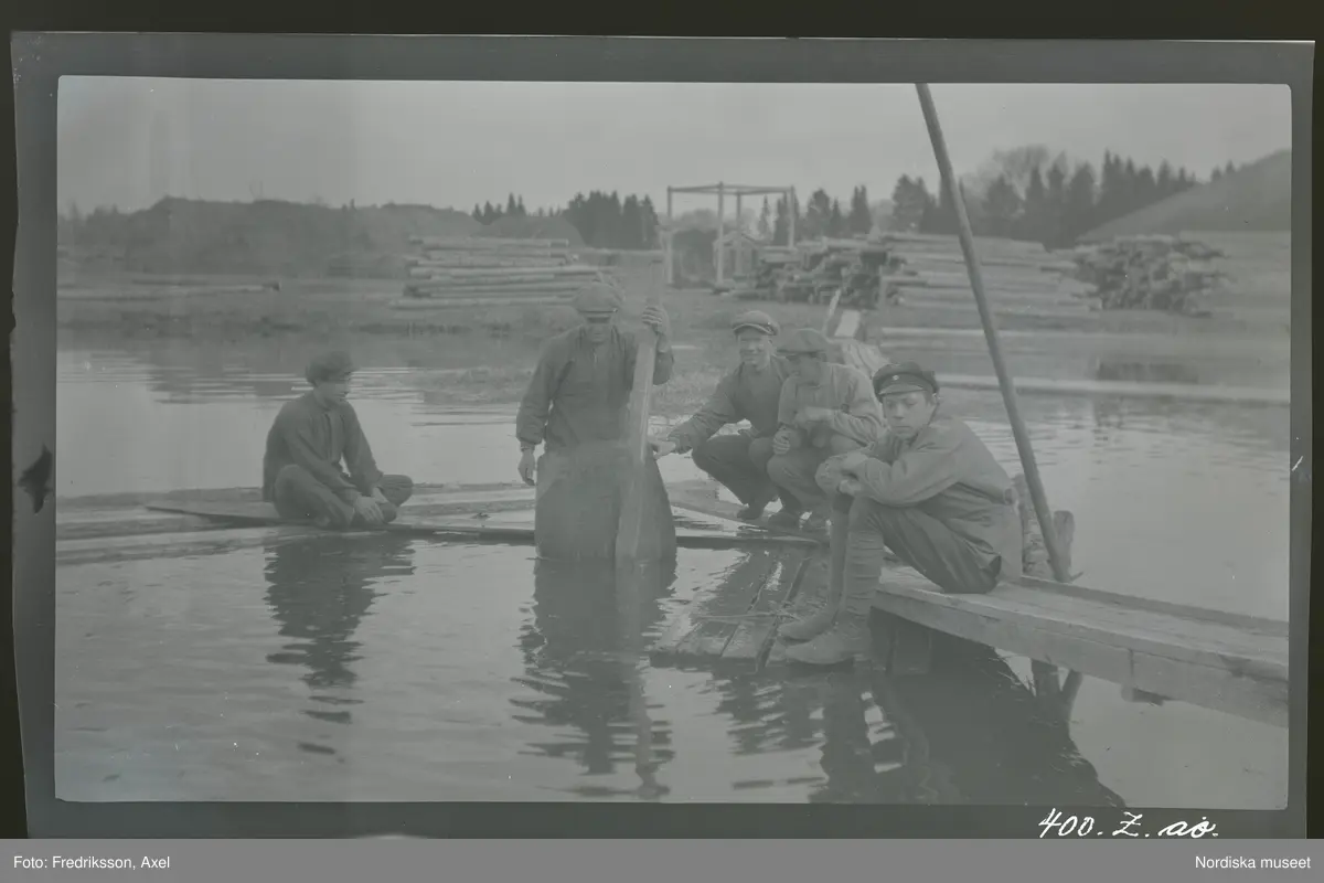 Ett arbetslag vid ett vattendrag. En man står i en tunna. På stranden bakom dem ligger högar med timmer.