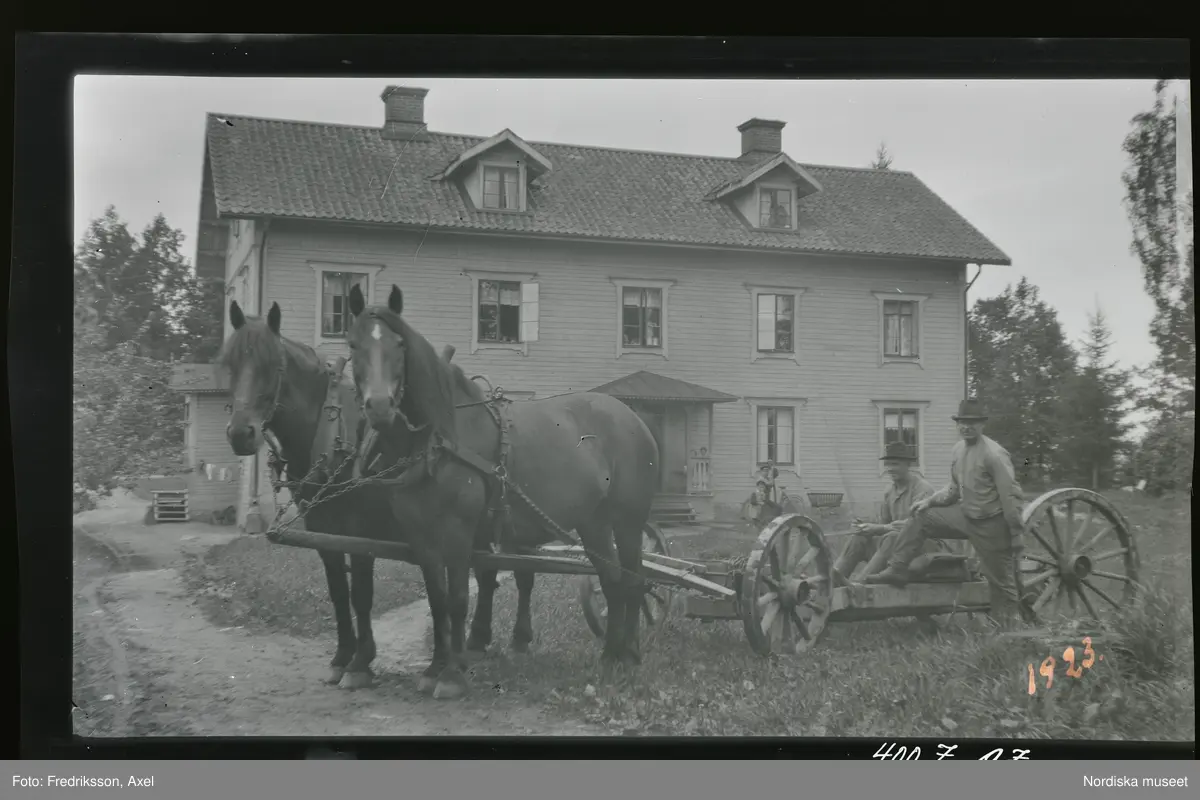 Två män på en kärra dragen av två hästar, ståendes framför ett hus.