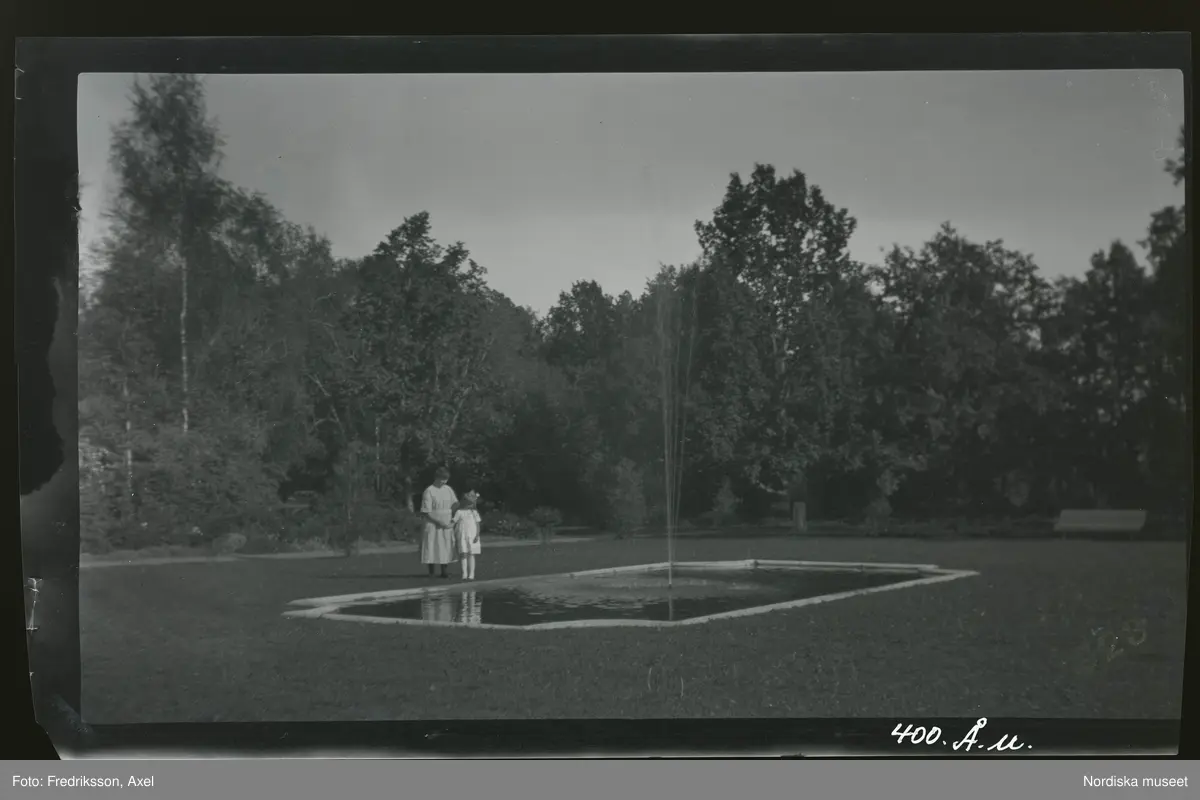 En kvinna och en flicka, fotografens fru och dotter, vid en fontän i Julita gårds park/ trädgård.