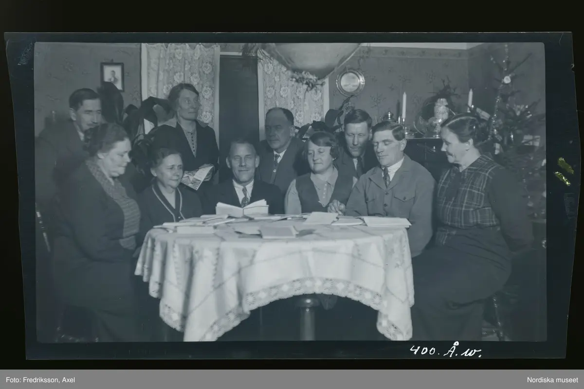 Ett sällskap samlat kring ett bord med uppslagna böcker/ trycksaker. Bakom dem en julgran.