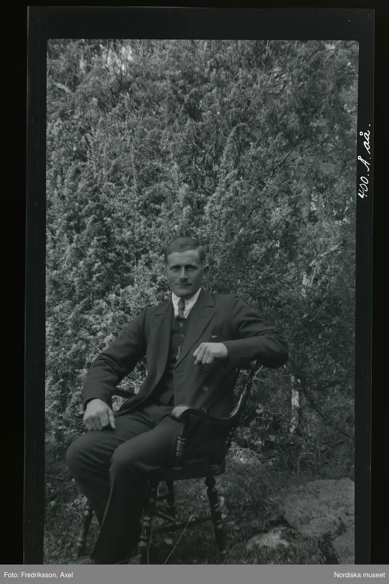 Porträtt av Axel Fredriksson, sittandes på en stol utomhus.