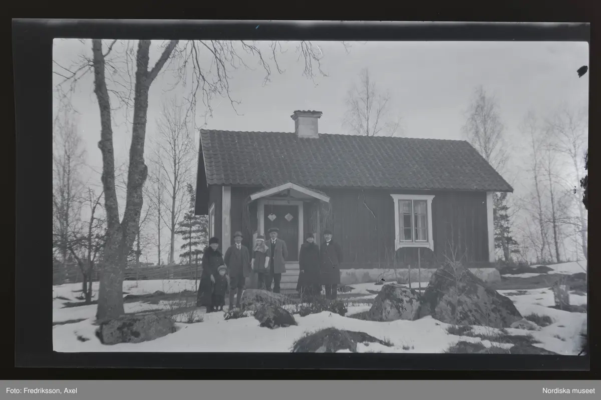 Familjen Fredriksson framför sitt hus. Axel i mitten med sin dotter Anna-Lisa ståendes på en sten, intill Ivar Fredriksson.