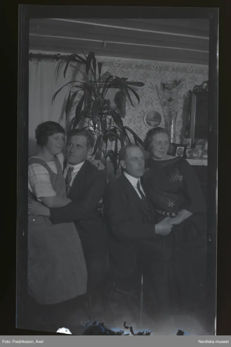 Två par sitter i ett rum, kvinnorna sitter i knät på männen. Till vänster makarna Frida och Axel Fredriksson.
