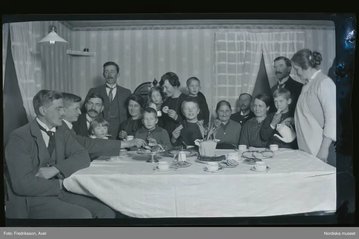 Ett sällskap sitter kring ett bord dukat med fika; kaffekoppar, bullar och kakor. Längst till vänster sitter Axel Fredriksson, intill sin bror Ivar. Ståendes med en kringla i handen hans fru Frida. Vid bordet sitter även föräldrarna Fredrik Vilhelm Eriksson och Anna Maria Larsdotter.