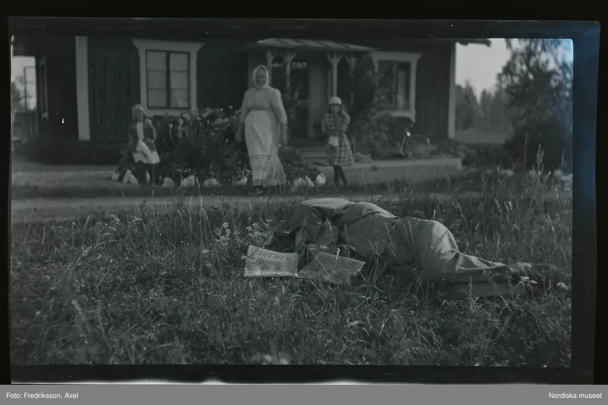 Axel Fredriksson ligger i gräset med två nummer av tidskriften Vårt Hem intill sig. En äldre kvinna och två flickor står längre bort i trädgården och betraktar honom.