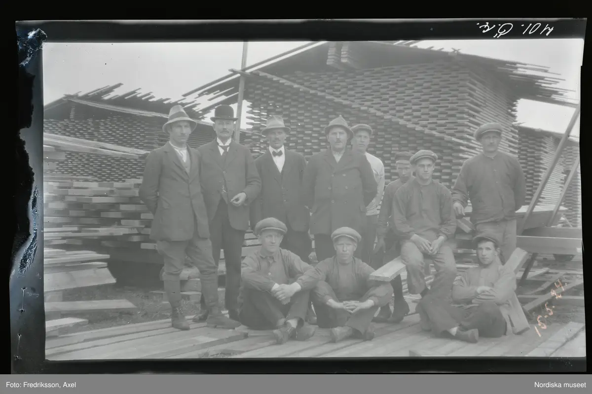 "Klampare vid Fogelstads såg (virkesortering). Stående 1.a fr.v. skogvaktare Öhström. Stående pojke 6:e fr.v. sågarens Evert. Sittande 1:a fr.v. Gustav Larsson, riksdagsman. Fogelstad."