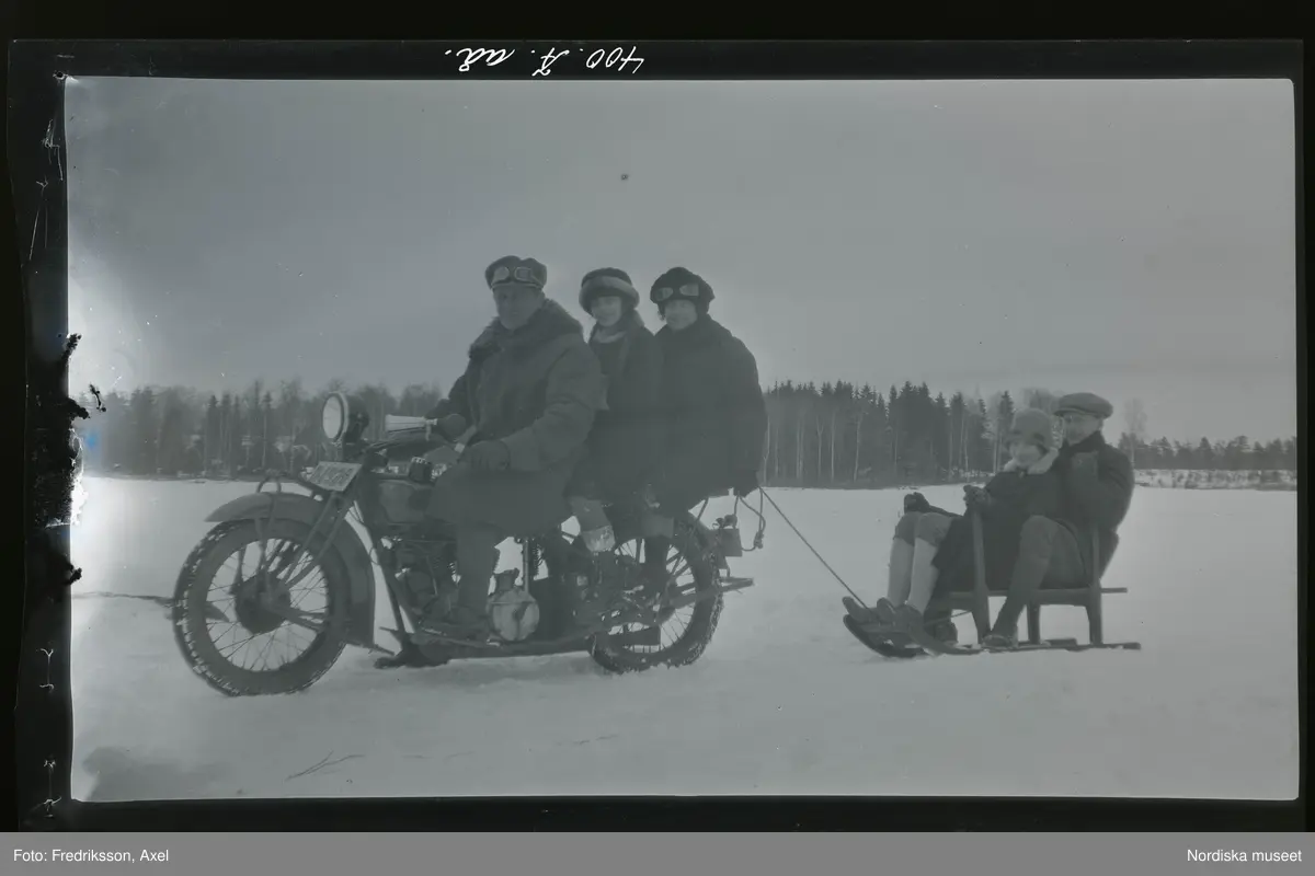 Tre personer på en moped/ motorcykel drar en släde med två personer efter sig på ett snötäckt fält.