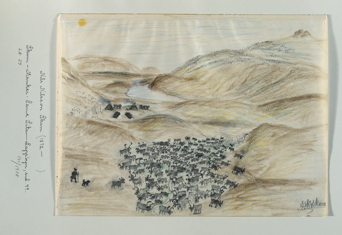 Teckning av Nils Nilsson Skum, troligen utförd mellan 1930 och 1938. Renhjord i fjällvärld. I bakgrunden kåtor. Man bryter upp från vårvistet.
