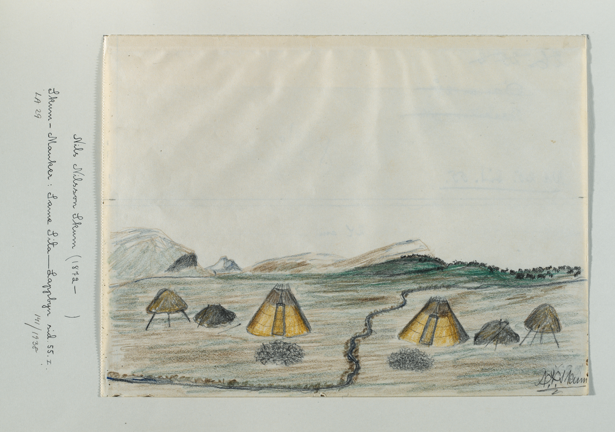 Teckning av Nils Nilsson Skum, troligen utförd mellan 1930 och 1938. Kåtor, i bakgrunden renhjord. Sitan har slagit läger och man vilar efter flytten. Vårsommar.