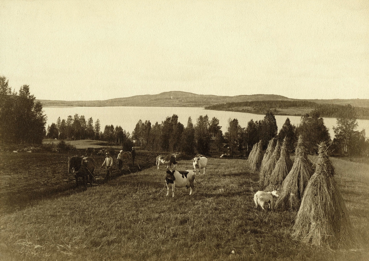 Arbete med jordbearbetning och skörd i Leksand. Boskap och hässjor, i bakgrunden utsikt över Siljan.