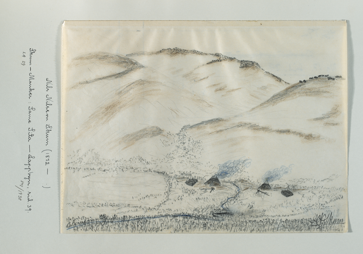 Teckning av Nils Nilsson Skum, troligen utförd mellan 1930 och 1938. Kåtor och renar vid fjäll. Vår. Raiderna har kommit fram och sitan slagit läger i en sänka.
