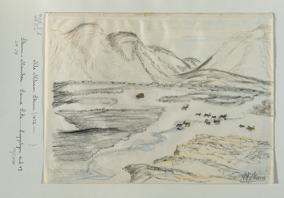 Teckning av Nils Nilsson Skum, troligen utförd mellan 1930 och 1938. Renar, vajor och kalvar, tar sig över fjällbäck. En björn har tagit en ren. Vår.