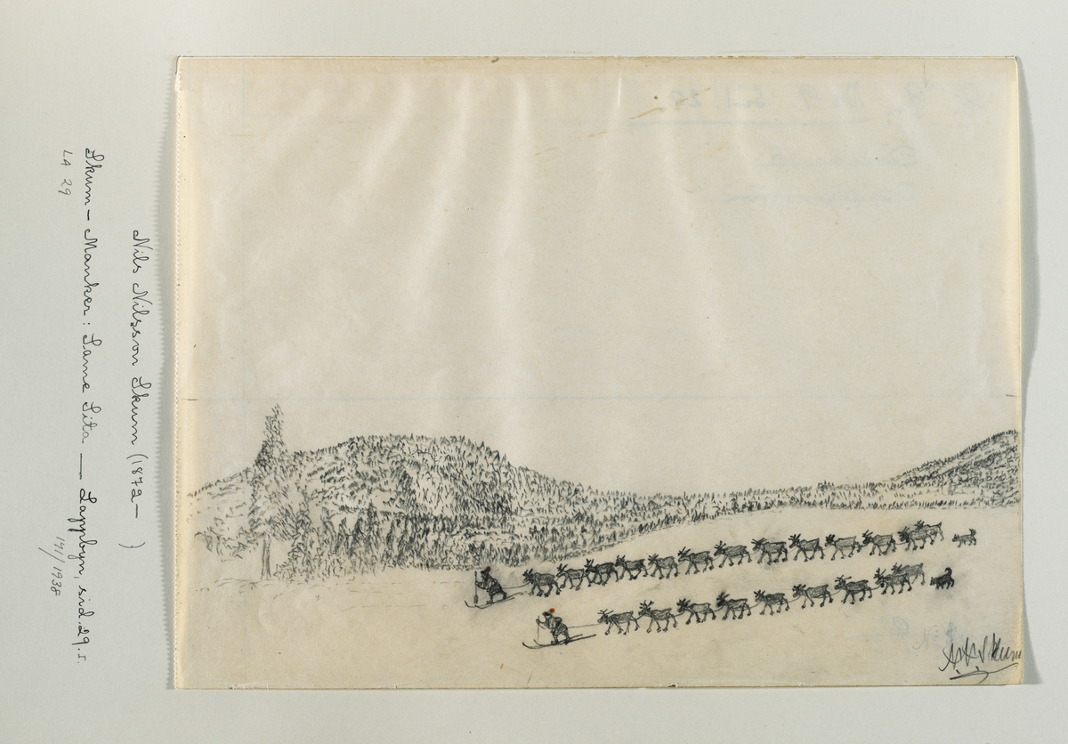 Teckning av Nils Nilsson Skum, troligen utförd mellan 1930 och 1938. Två samer skidar med var sin rad kopplade renar bakom sig, hundar följer efter. Det är härkarna, köroxarna, som hämtas. Vårvinter.