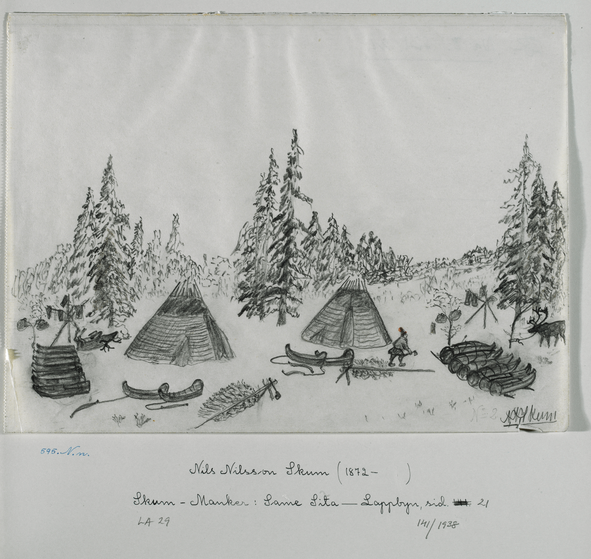 Teckning av Nils Nilsson Skum, troligen utförd mellan 1930 och 1938. Vinterviste, kåtor bland granar. Ackjor ligger i rader. Vårvinter.
