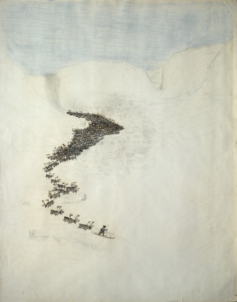 Kritteckning av Nils Nilsson Skum, möjligen utförd mellan 1930 och 1938. Renhjord i fjällandskap.