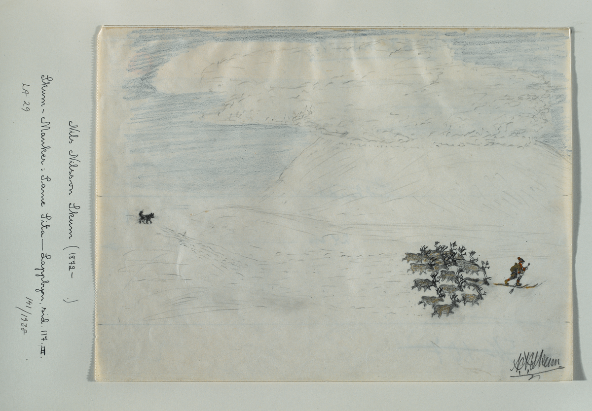 Teckning av Nils Nilsson Skum, troligen utförd mellan 1930 och 1938. Same på skidor med renhjord, hund följer efter. Vinter.